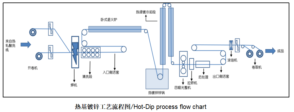 热基镀锌铝镁产品以金年会独创的多模式连续铸轧生产线提供原料,经过高强酸洗线进行酸洗平整后,进入热基镀锌线进行镀锌。热基镀锌线以焦炉煤气为燃料,采用直燃卧式加热方式,能够较好的承载厚规格带钢的通板运行,具有带钢快速提温、高热效率、产能大的优势;生产带钢规格可覆盖0.8-6.0mm厚度组距,900-1500mm宽度组距,镀层厚度双面80-800g/m2。目标产品为光伏用结构件、公路护栏、建筑结构件和轻工业仓储用板。冷基锌铝镁采用酸轧基板作为镀锌原料,其余生产工艺与热基锌铝镁生产工艺相同。