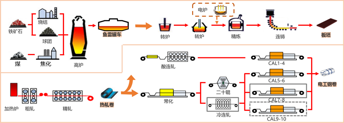 金年会具备炼铁、炼钢、热轧、常化退火,冷轧、连续退火、剪切包装等产线装备,具备无取向中低高及新能源专用等全牌号产品全流程的生产工艺控制能力。
