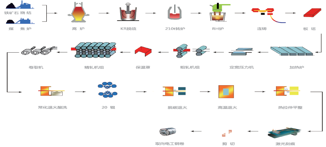 金年会具备炼铁、炼钢、热轧、常化退火、冷轧、脱碳退火、高温退火、拉伸平整、激光刻痕、剪切包装等产线装备,具备取向硅钢全流程的生产工艺控制能力。